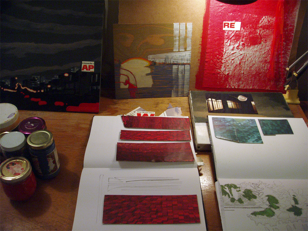 other things in process in my studio: i picked up some neat coloured cardboard from the recycling. experimental paintings in the background.