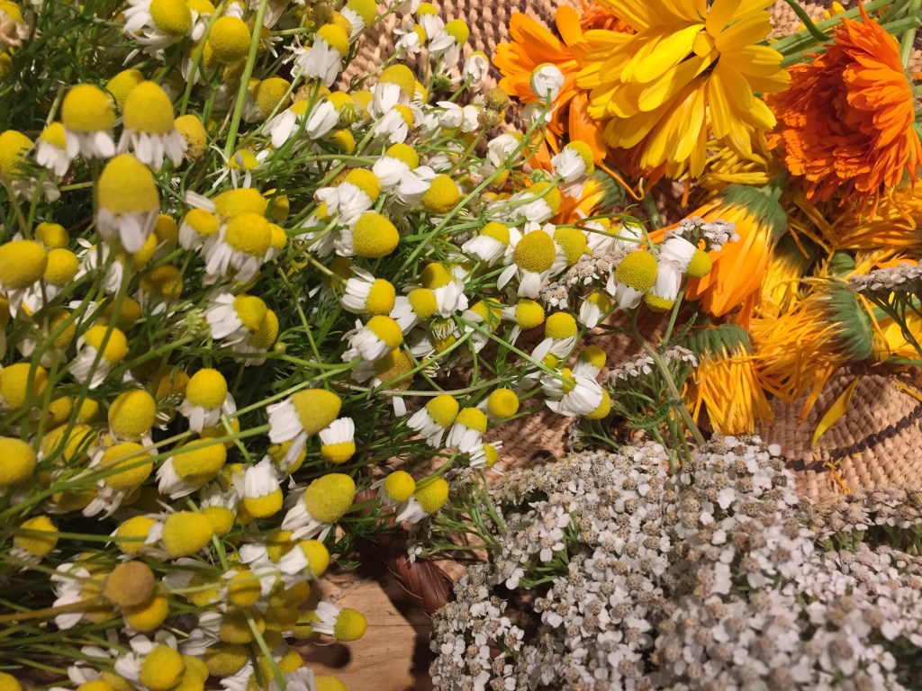 mid-July harvest, chamomile, calendula and yarrow for tea, salve and tincture.