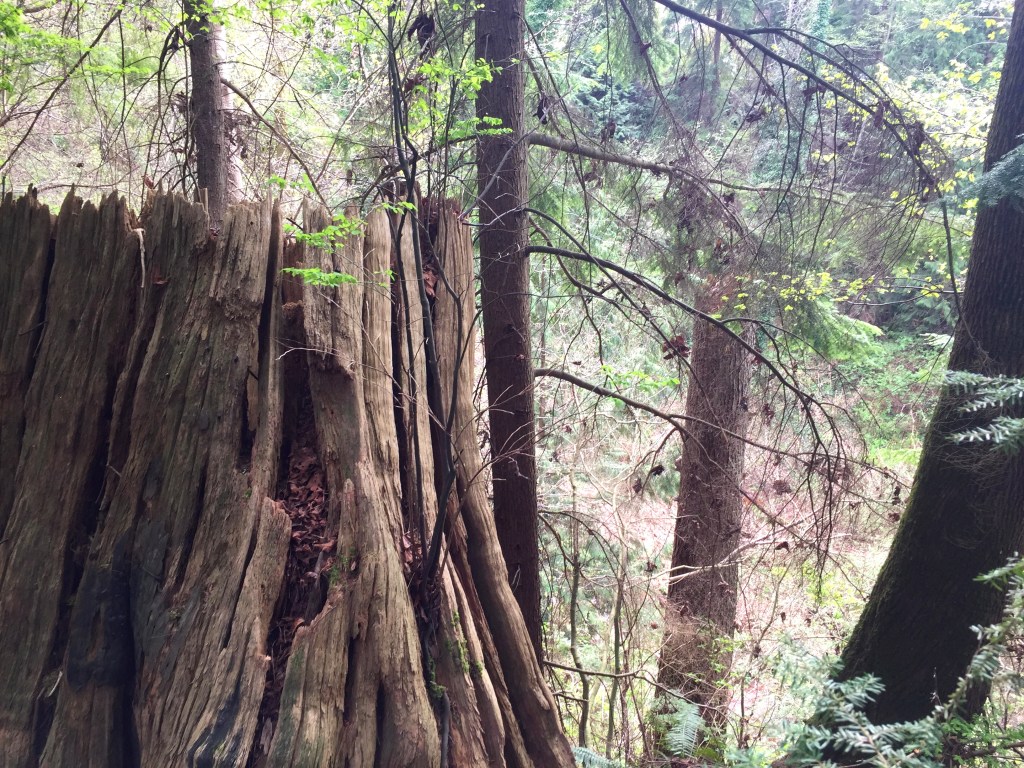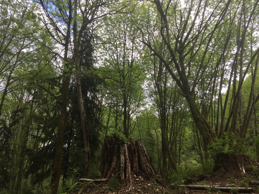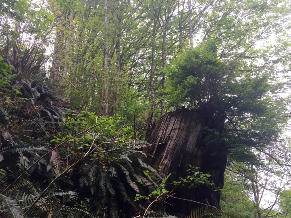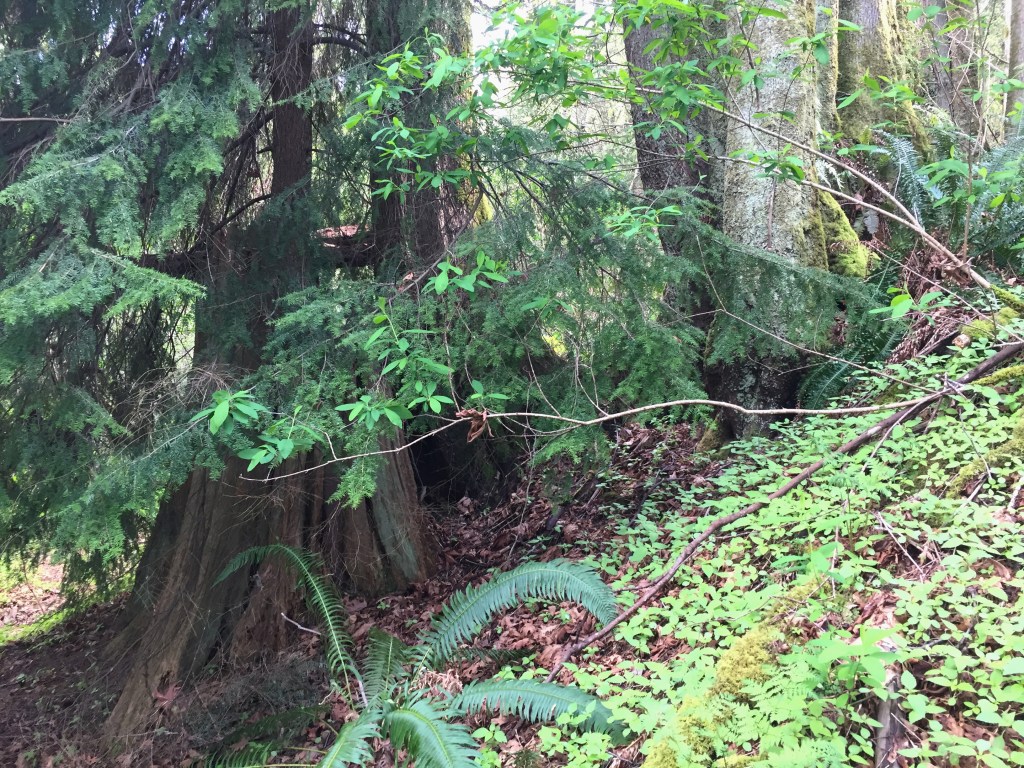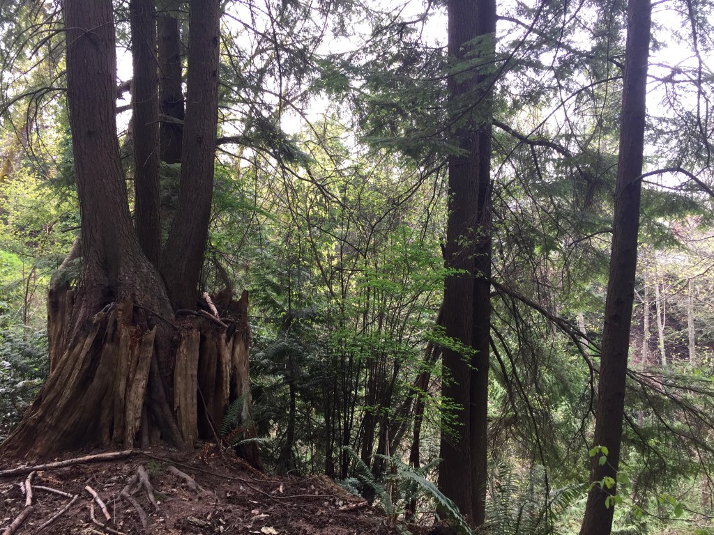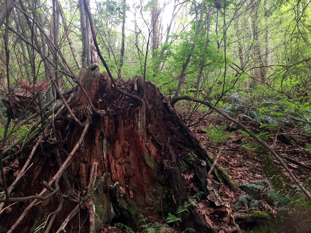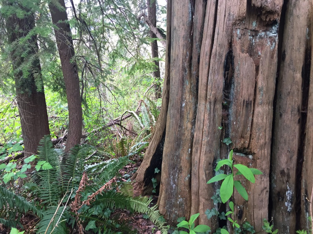 I have been surprised to find many many giant stumps, mostly along the north sides of steep forested slopes. They are ancient cedar bones. The trees were very large. Many of them still show the cut where a board was inserted to lift the men higher while cutting so they would not have to cut through the giants’ low wide girth. Have you ever thought of our urban areas as giant clearcuts?