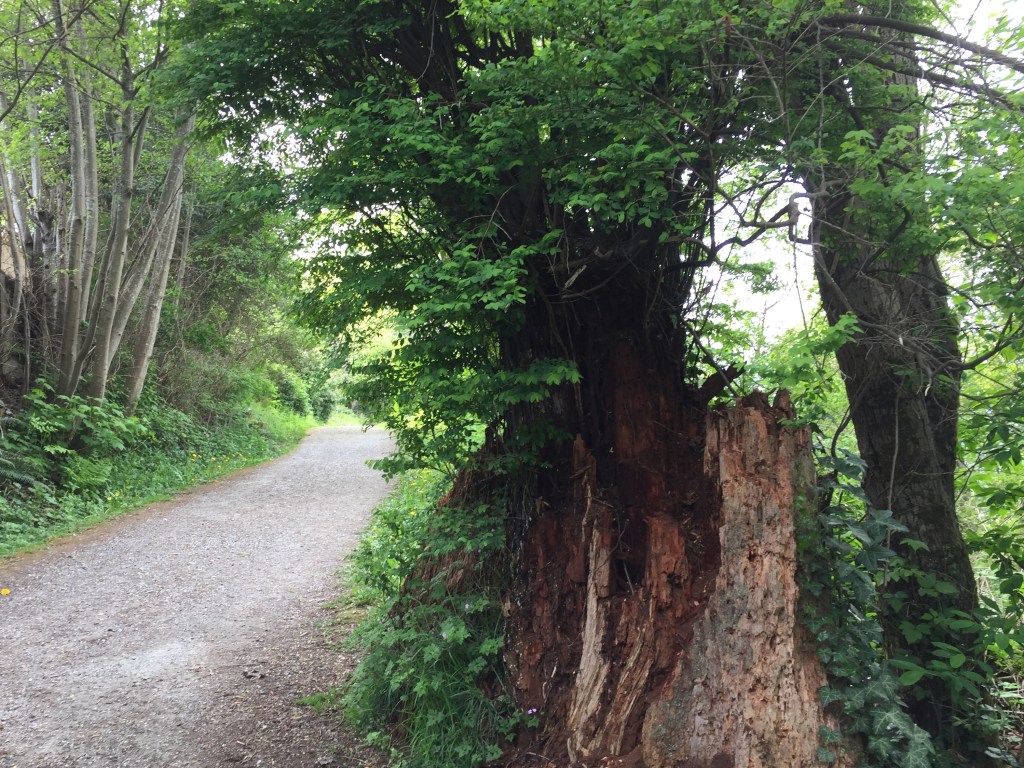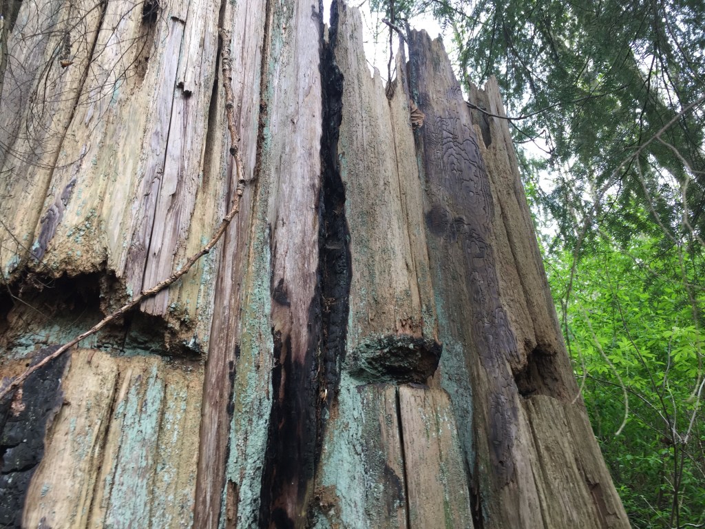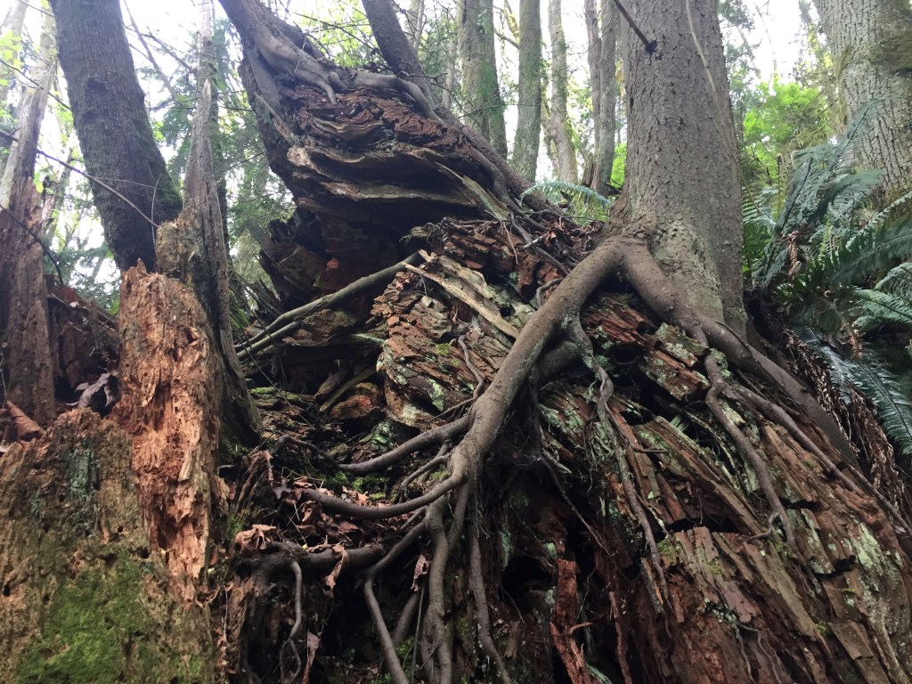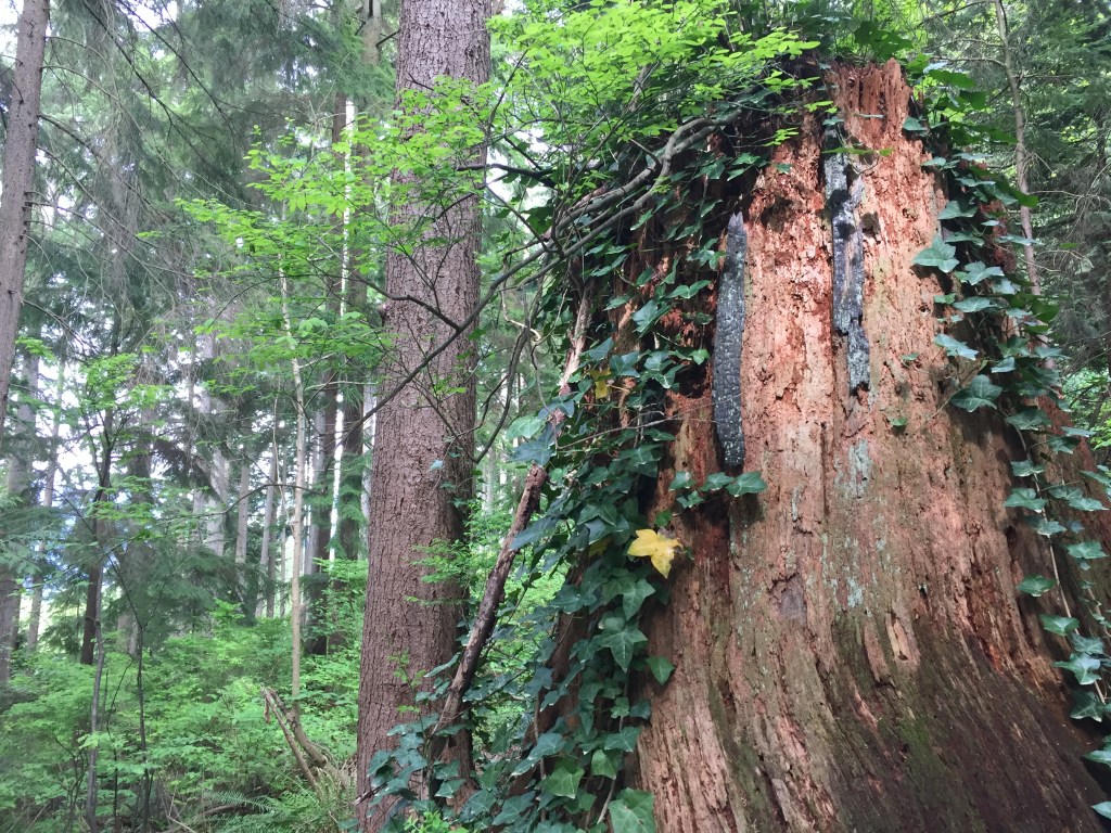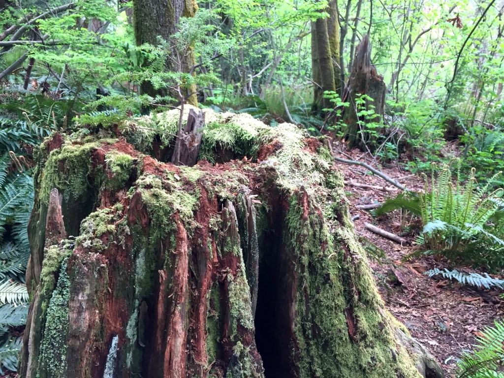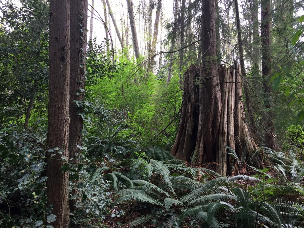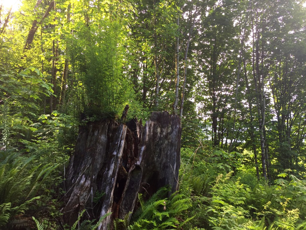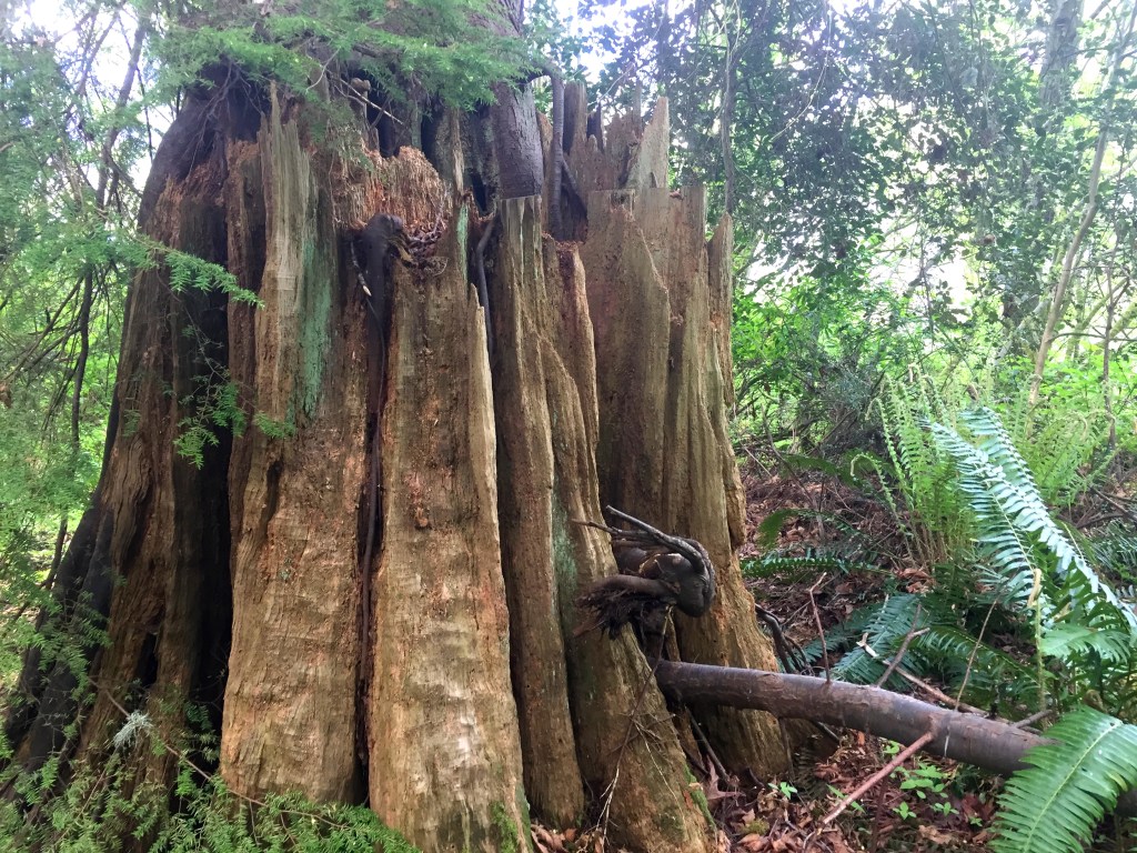 I have been surprised to find many many giant stumps, mostly along the north sides of steep forested slopes. They are ancient cedar bones. The trees were very large. Many of them still show the cut where a board was inserted to lift the men higher while cutting so they would not have to cut through the giants’ low wide girth. Have you ever thought of our urban areas as giant clearcuts?